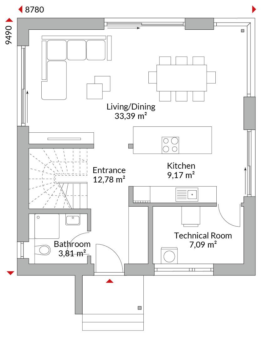 One-and-a-half-storey house with entrance canopy over elevated front door and two bedrooms on the upper floor. Master bedroom with large walk-in wardrobe area. Raised ground floor with corner glazing and taller windows, designed as open-plan kitchen/living/dining area with sliding doors to the terrace. Guest WC with shower, bathroom with bathtub, shower and double vanity unit, technical room, entrance hall and hallway. Gable roof with wide eaves (60 cm), 40° pitch. Knee wall height: 1.00 m.