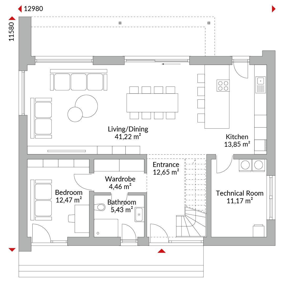 One-and-a-half-storey house with entrance canopy over the higher front; entrance with staircase; open-plan living/dining area with sliding doors to the terrace; kitchen with peninsula hob; technical room; single bedroom or study with walk-in wardrobe area and en-suite shower room; master bedroom on upper floor with walk-in wardrobe area and en-suite with double sinks; two single bedrooms; family bathroom; gable roof with 38° roof pitch; knee wall height 1.75 metres.
