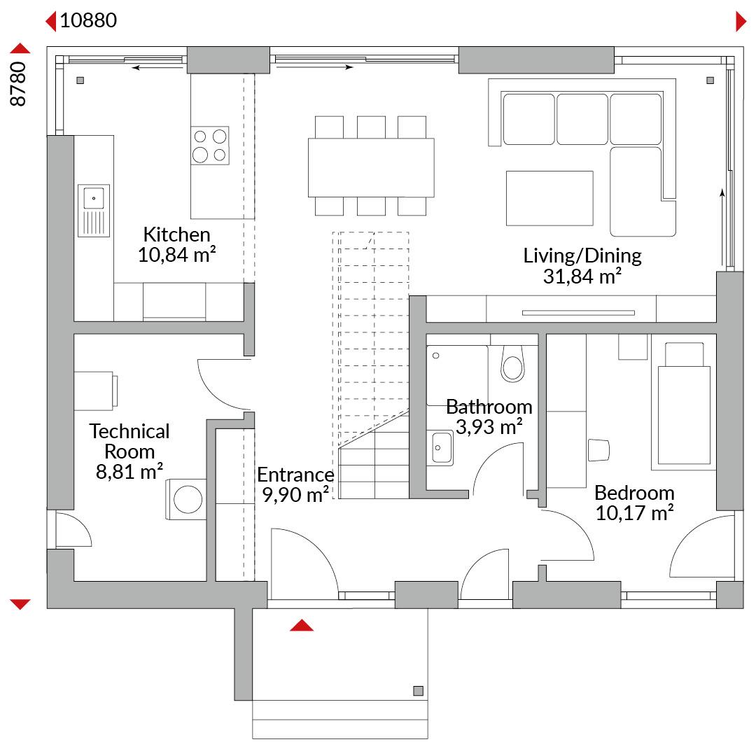 Two-storey house with entrance canopy over elevated front door and three bedrooms on the upper floor plus spacious hallway. Master bedroom with en-suite bathroom including freestanding bathtub, double vanity unit and shower. Second bathroom with bathtub, shower and double vanity unit. Raised ground floor with corner glazing in living/dining area and kitchen, and taller windows, designed as open-plan kitchen/living/dining area with sliding doors to the terrace. Additional room with private guest WC and shower, technical room and entrance hall. Hipped roof with wide eaves (80 cm), 22° pitch.