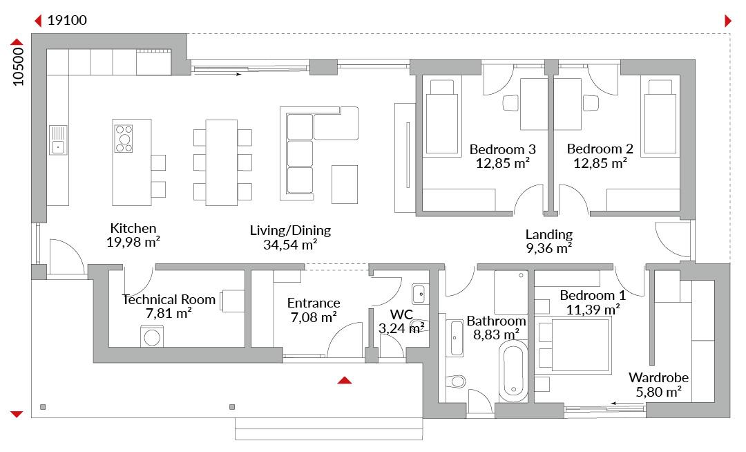 Three-bedroom bungalow with fully covered entrance and elevated front door with glass panel. Additional exterior access to the kitchen. Raised ground floor with taller windows, designed as open-plan kitchen with adjoining living/dining area and sliding doors to the terrace. Hipped roof without overhang, 25° pitch.