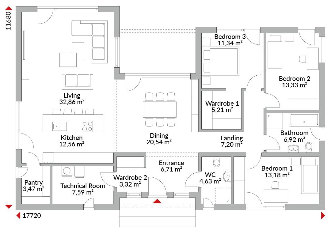 Three-bedroom L-shaped bungalow with integrated canopy over elevated front door with side glass panels. Master bedroom with en-suite bathroom featuring freestanding bathtub, double washbasin and shower. Two separate cloakrooms, one usable as a walk-in wardrobe area. Raised living area with corner glazing and taller windows, designed as open-plan kitchen, living and dining space with sliding doors to the terrace. Pantry, guest bathroom with shower, technical room, entrance area and hallway. Hipped roof with wide eaves (60 cm) and 22° pitch, including terrace canopy.