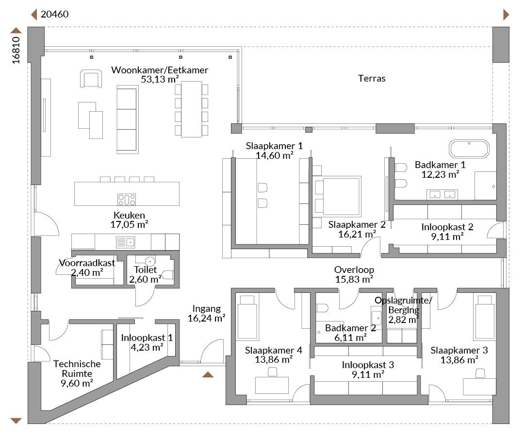 Deze mooie bungalow biedt 220 vierkante meter wonen op één niveau, met kamerhoge ramen voor fantastisch daglicht en transparantie. De architectuur kenmerkt zich door grote gevelpanelen en een overdekt terras, wat zorgt voor een duidelijk en strak ontwerp.