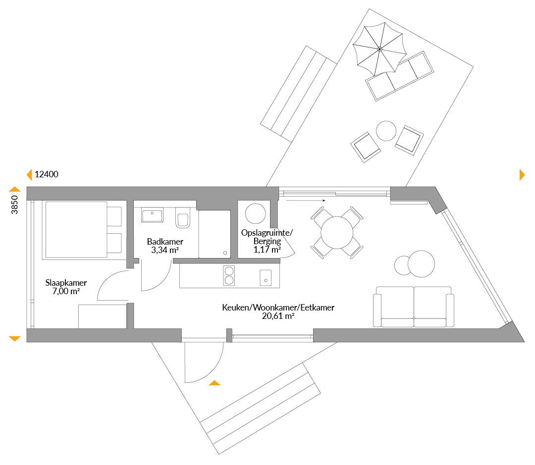 Heb je net wat meer ruimte nodig? Als je op zoek bent naar een éénslaapkamer modulair vakantiehuis met iets meer ruimte, dan hebben wij de grotere NEXT Holiday 32 L-1. Deze L-versie is één meter breder, waardoor je in totaal 9 m² extra woonoppervlak krijgt. Dat merk je vooral in de slaapkamer en de leef-/eetkamer, waar ook twee extra gasten kunnen slapen op de slaapbank en iedereen gemakkelijk een plekje aan de eettafel vindt. Ook de kitchenette en de panoramische ramen zijn groter in de L-versie. Dit minimalistische vakantiehuis is daardoor perfect voor een weekendje weg met het hele gezin.