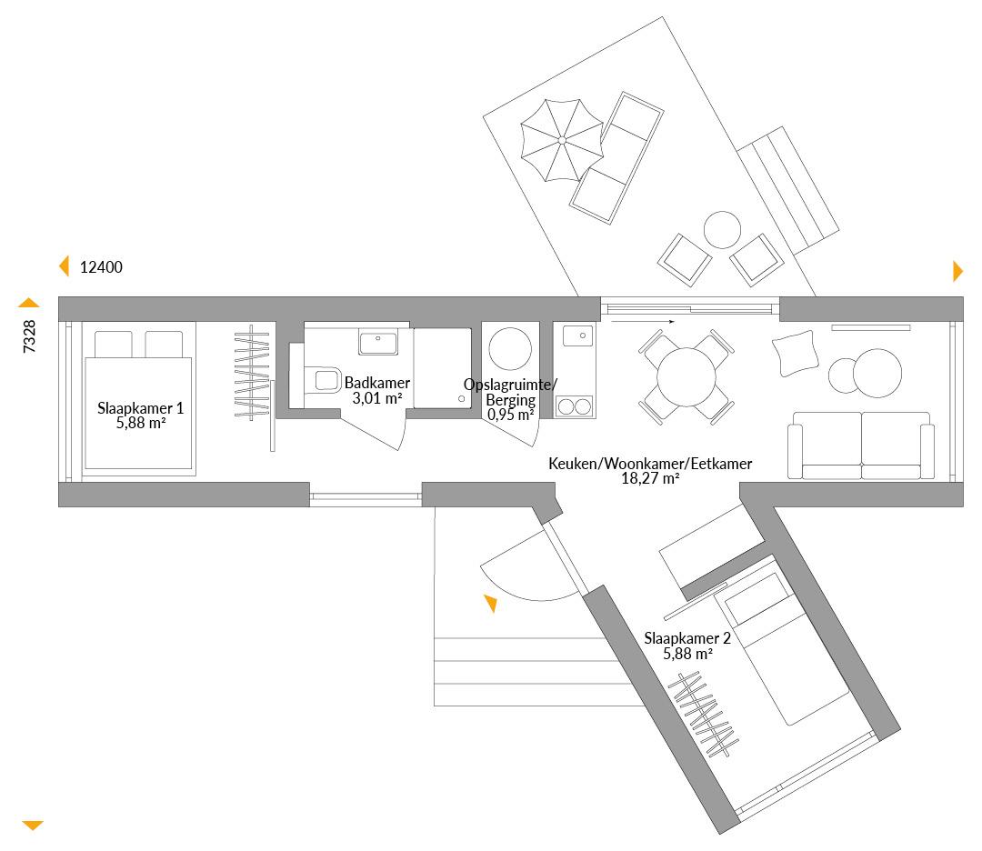 Voeg extra modules toe: Als het perceel ruimte biedt voor een iets bredere woning – in dit geval ruim 7 meter – kan een extra smalle S-module je vakantiehuis nóg comfortabeler maken. Door een zijvleugel toe te voegen ontstaat er een extra slaapkamer en een uitnodigende entree, wat 11 m² extra woonoppervlakte oplevert ten opzichte van de NEXT Holiday 23 S-1. Panoramische glaswanden zorgen voor het gevoel dat je midden in de natuur zit!