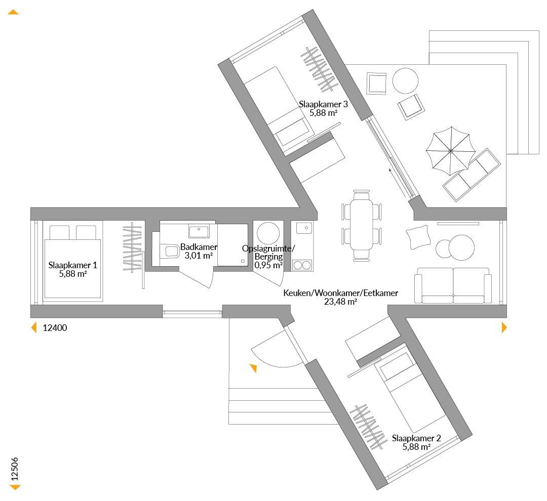 Is er een UFO geland? Deze uitvoering is opgebouwd uit S-modules met twee zijvleugels en doet nog het meest denken aan een UFO! De drie slaapkamers bieden voldoende comfortabel woonruimte voor een groter gezin van zes personen, terwijl twee gasten op de slaapbank kunnen overnachten. Elke slaapkamer beschikt over een volledig glazen wand, wat het interieur ruimer doet aanvoelen én de natuur dichterbij brengt. In deze compacte woning van 45 m² is ook ruimte voor een mini-keuken, een doucheruimte en een technische ruimte. Iedereen komt samen aan de eettafel in het hart van de woning, waar een grote schuifpui toegang geeft tot het terras.