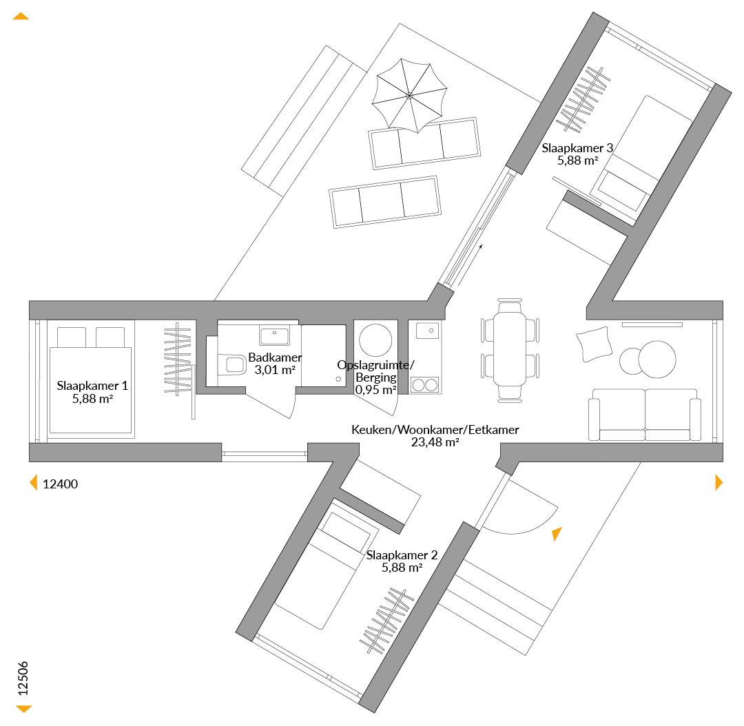 Flexibele mogelijkheden: Net als de vorige versie heeft ook deze S-modulehuis twee zijvleugels, elk met een slaapkamer. Dit zorgt voor een zeer royale indeling, ideaal voor vier personen. Als je met meer mensen bent, kun je stapelbedden plaatsen en is er ook extra ruimte voor een kledingkast of opbergruimte, waardoor de leefruimtes comfortabel blijven voor een groter gezin. Het terras biedt extra buitenruimte, maar ook bij regen kan iedereen zich terugtrekken in zijn eigen plekje of samenkomen aan de grote tafel.